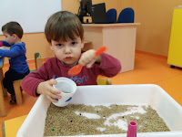 Todos los materiales son diferentes en aspecto, color, tamaño, textura.. ofrecen experiencias y posibilidades de manipulación también diferentes. En esta ocasión les ofrecimos lentejas con abalorios que resaltaban entre ellas.